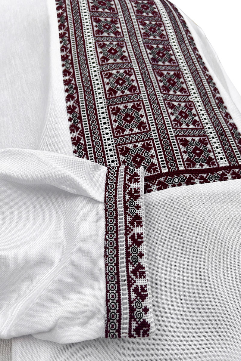 Realizată din pânză de bumbac, cusută cu motive tradiționale, în nuanțe de vișiniu și negru. Elegantă, ușor de purtat, întreținut și asortat.